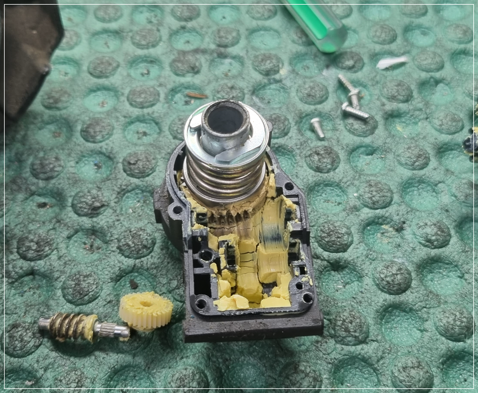 모터 기어가 파손되어 있네요. 테스트 완료한 모터 기어로 교체할게요.