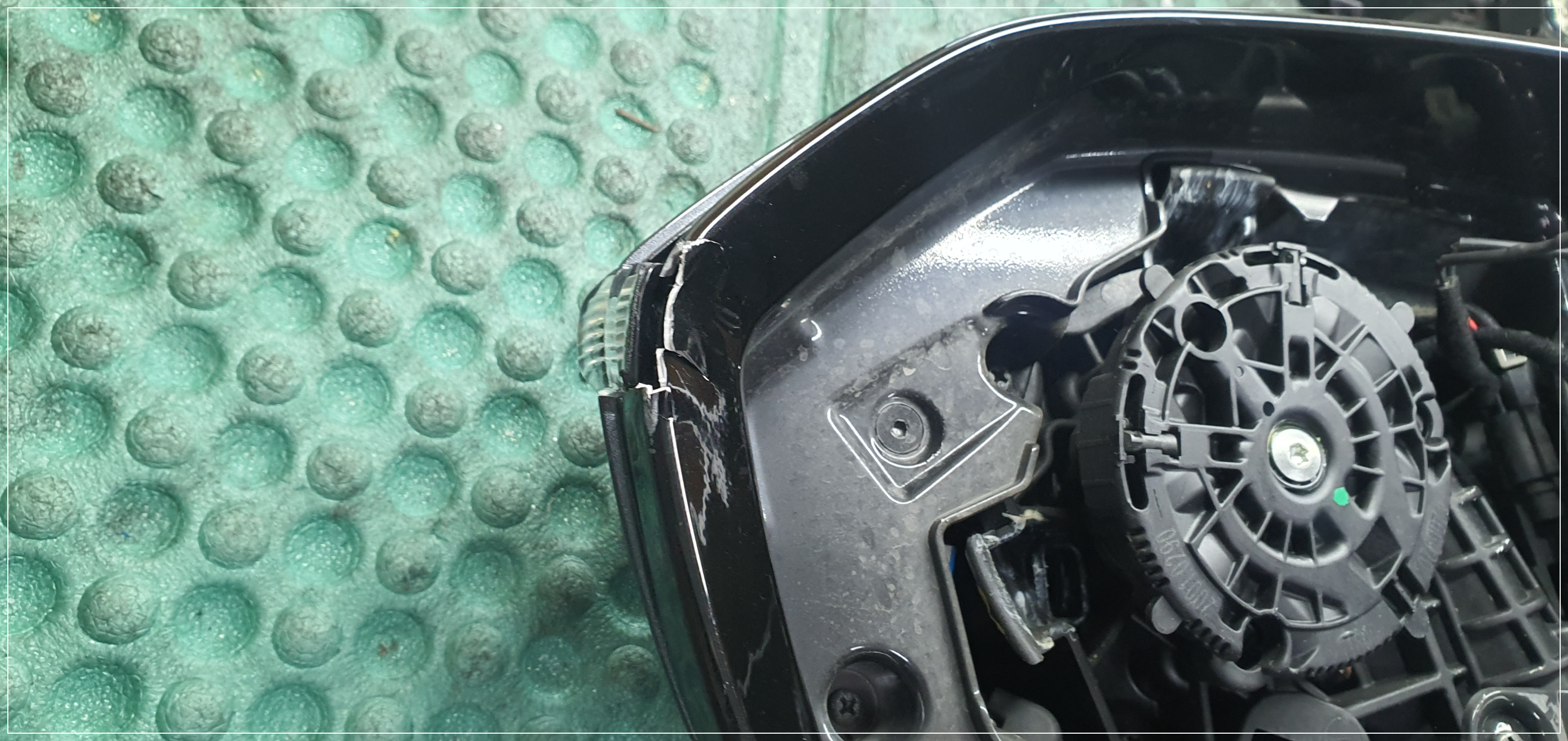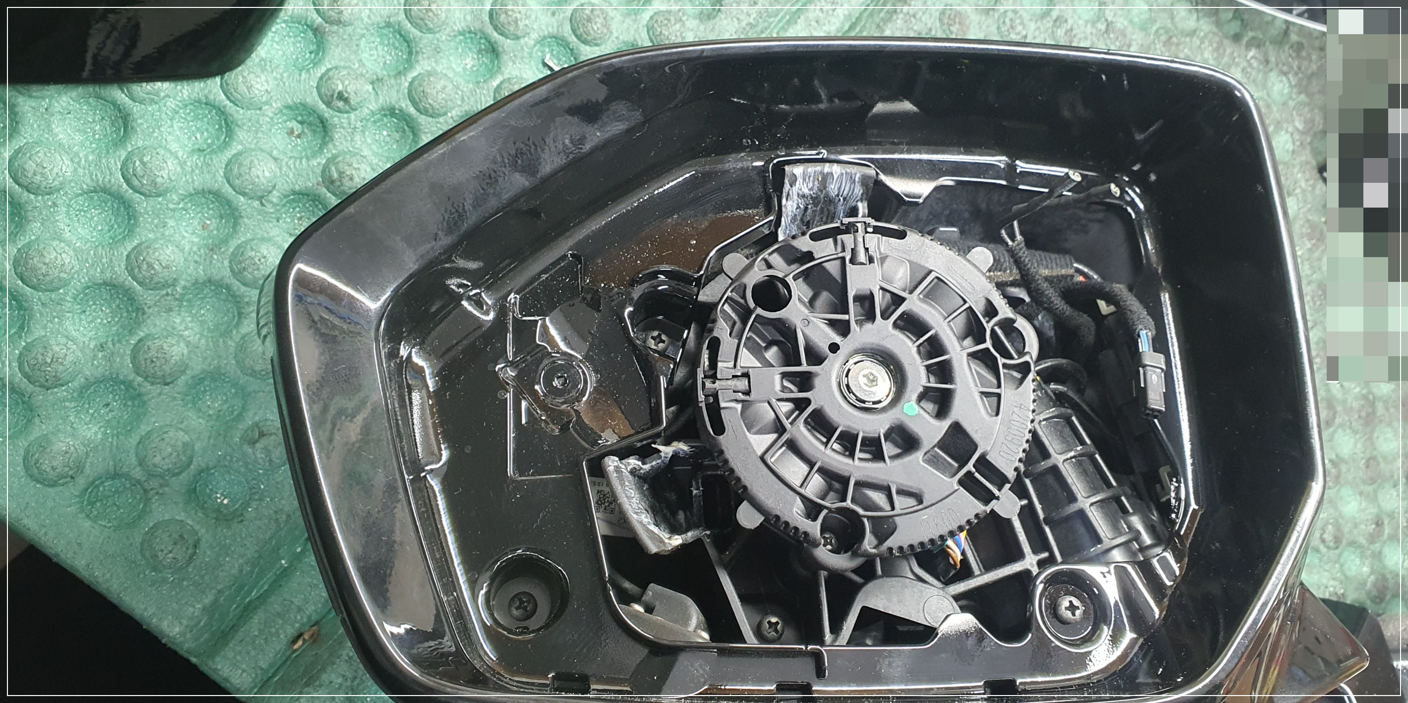 거울을 먼저 탈거합니다. 사이드리피터도 같이 파손되는 경우가 많은데 다행히 깨지지 않았습니다. 사이드리피터도 따로 공급이 되는 부품이긴 하지만 교환이 쉽지 않습니다. 깜빡이 기능이 있어 깨진 부위로 물이 들어가거나 습기가 차면 안전상 좋지 않으니 빨리 교환하셔야 합니다.